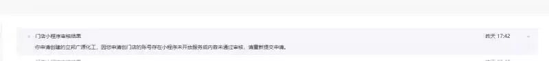 你好,您申请创门店的账号存在小程序未开放服务或内容,详情请参考小程序运营规范:https://developers.weixin.qq.com/miniprogram/product/#5-%E8%A1%8C%E4%B8%BA%E8%A7%84%E8%8C%83
