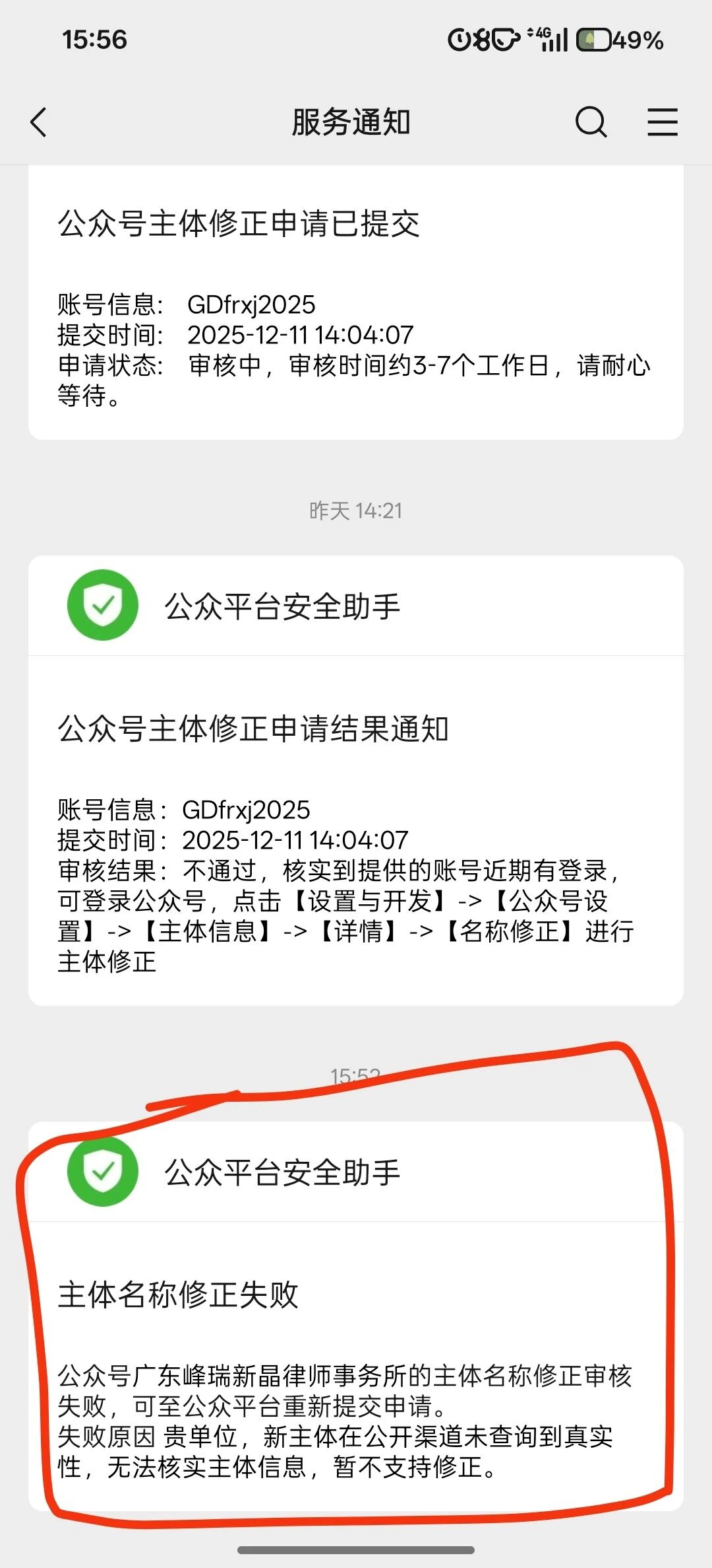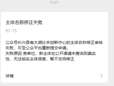 我们公司改名字了,在公众号后台申请了更改主体名字,但是申请不通过,说申请新主体在公开渠道未查询到真实性,这是什么意思?是去哪里查的
