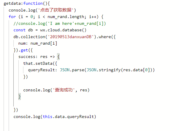 当我需要把查询到的数据在console中显示出来时,会出现一个很神奇的bug。如上图,我不加console.log(this.data.queryResult)这一行代码的时候,可以在console中看到res,但是加了console.log(this.data.queryResult)这一行后,就无法再console中显示res了