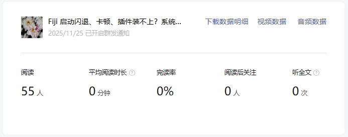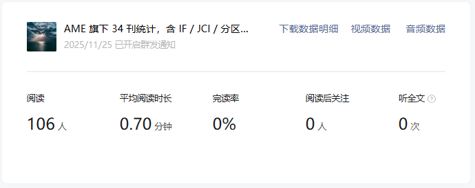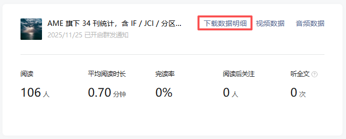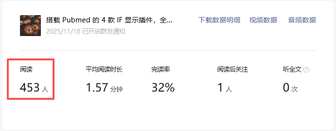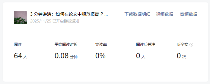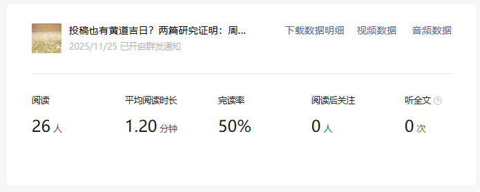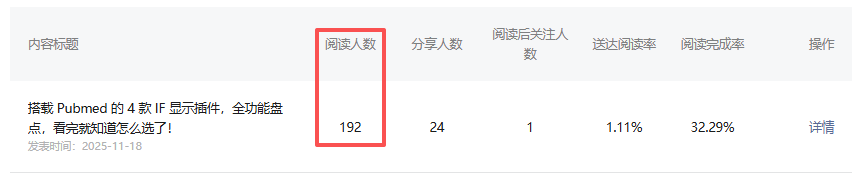 这个数据相差已经很大了,因为之前是统计7天的阅读量,所以我怀疑过是不是服务号这七天数据就是这么差(虽然我每天看不是这样,但我当时没有截图之类留证,所以开始怀疑自己),于是我点开了每篇文章后台的详情,也就是这个位置: