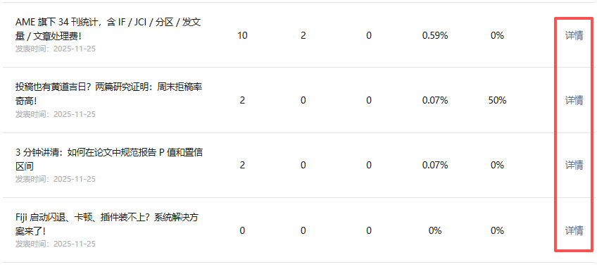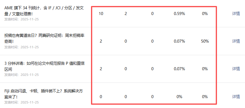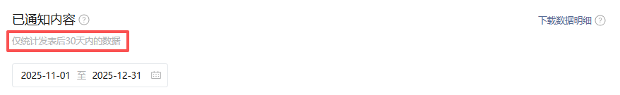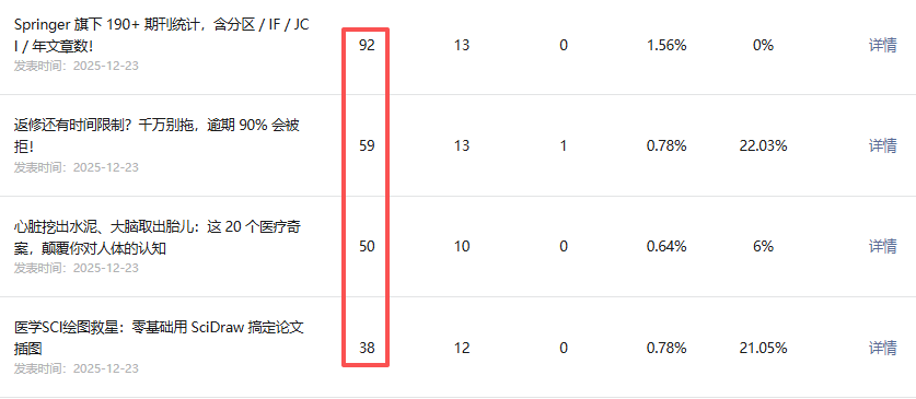 随后我想到,会不会是我对规则的理解有误,我又查看了就近1个月的数据,这样这两个位置都在统计中,应该不存在差距,实际情况也是如此,12月到1月上旬一共发文5次,总统计界面与详情界面的数据一致。