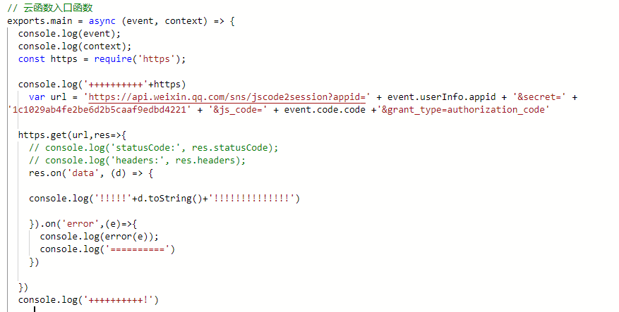 大佬们,小弟想在云函数里发个Node.js https get请求,日志上就是打印不出来啊,求大神指点
