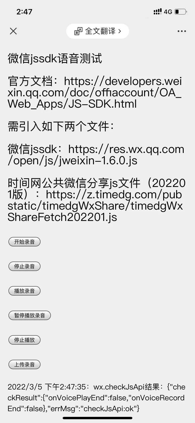 { "checkResult": { "stopVoice": true, "onVoicePlayEnd": false, "uploadVoice": true, "playVoice": true, "stopRecord": true, "pauseVoice": true, "checkJsApi": true, "onVoiceRecordEnd": false, "startRecord": true, "downloadVoice": true }, "errMsg": "checkJsApi:ok" }Android: