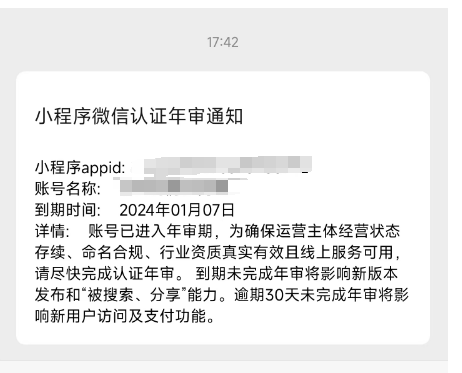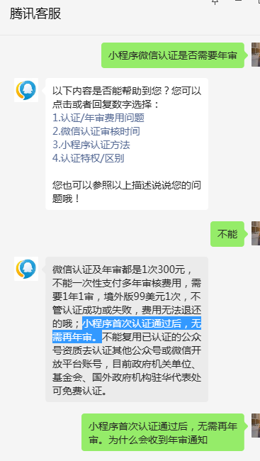 我的小程序19年就注册认证成功了,今天竟然收到小程序年审通知了,不是说小程序认证一次,后续无需再次认证的吗?太奇怪了,求解答!