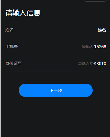 <view class="page_title" style="{{pageStyle.colorPrimary}}"> 请输入信息 </view> <view class="form_group" style="{{pageStyle.dividerBorder}}"> <label class="name">姓名</label> <input value="姓名" placeholder="请输入姓名" style="{{pageStyle.input}}" placeholder-class="placeholder" ></input> </view> <view class="form_group" style="{{pageStyle.dividerBorder}}"> <label class="name">手机号</label> <input type="number" placeholder="请输入手机号" style="{{pageStyle.input}}" placeholder-style="{{pageStyle.placeholderStyle?pageStyle.placeholderStyle:''}}" placeholder-class="placeholder" value="15268"></input> </view> <view class="form_group" style="{{pageStyle.dividerBorder}}"> <label class="name">身份证号</label> <input type="idcard" placeholder="请输入身份证号" style="{{pageStyle.input}}" placeholder-style="{{pageStyle.placeholderStyle?pageStyle.placeholderStyle:''}}" placeholder-class="placeholder" value="43010"></input> </view> <view class="button_box"> <button form-type="submit">下一步</button> </view> |