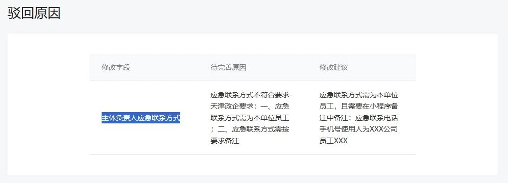 小程序备案被第三次驳回了,每次的驳回理由都是同一个,《主体负责人应急联系方式》,应急联系方式不符合要求-天津政企要求:一、应急联系方式需为本单位员工 ;二、应急联系方式需按要求备注。仔细研究驳回原因,发现问题出在主体负责人应急联系方式(我理解是公司法人,一开始我以为备注是小程序负责人应急联系方式的备注),于是我重新填写了公司资料(因为公司之前备案过一个小程序,所以一开始资料我以为无需更改),并按要求在主体负责人的应急电话中填写了除我(小程序负责人)及法人(主体负责人)之外员工的电话,最后按要求在小程序基础信息的备注中填写:应急联系电话手机号使用人为XXX公司(实际填写的我公司名称)员工XXX(实际填写该员工姓名);但是仍被第三次驳回,请问还要我怎么改?有没有遇到同样问题的朋友,请帮忙给出解决办法。