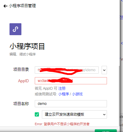 使用 https://developers.weixin.qq.com/sandbox 提供 的测试号创建项目 提示报错