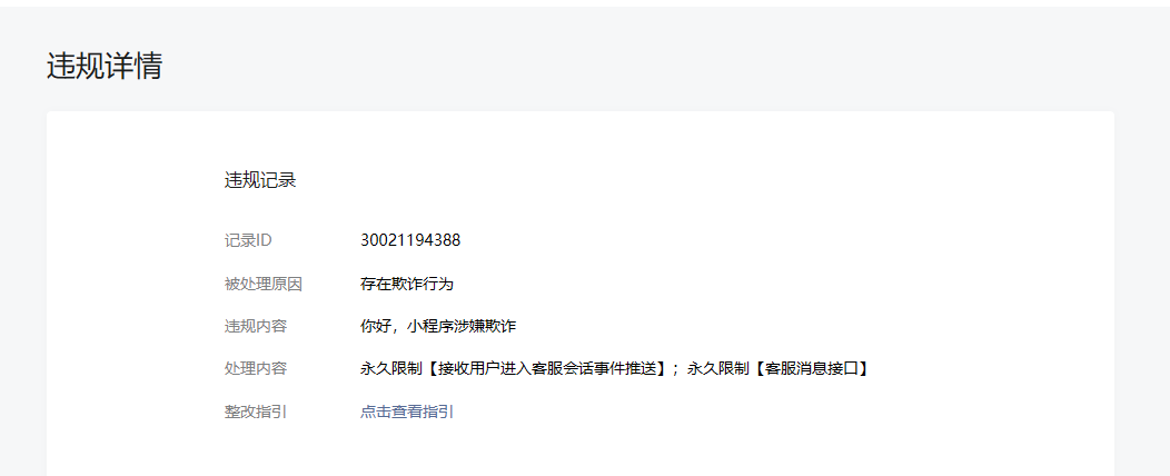 我方小程序还没上线,只是在开发测试阶段,用自己的两个微信测试了下客服信息的收发功能,就提示我违规了,还永久被限制了,希望官方人员处理一下这个问题,这机器人的监管机制有问题。