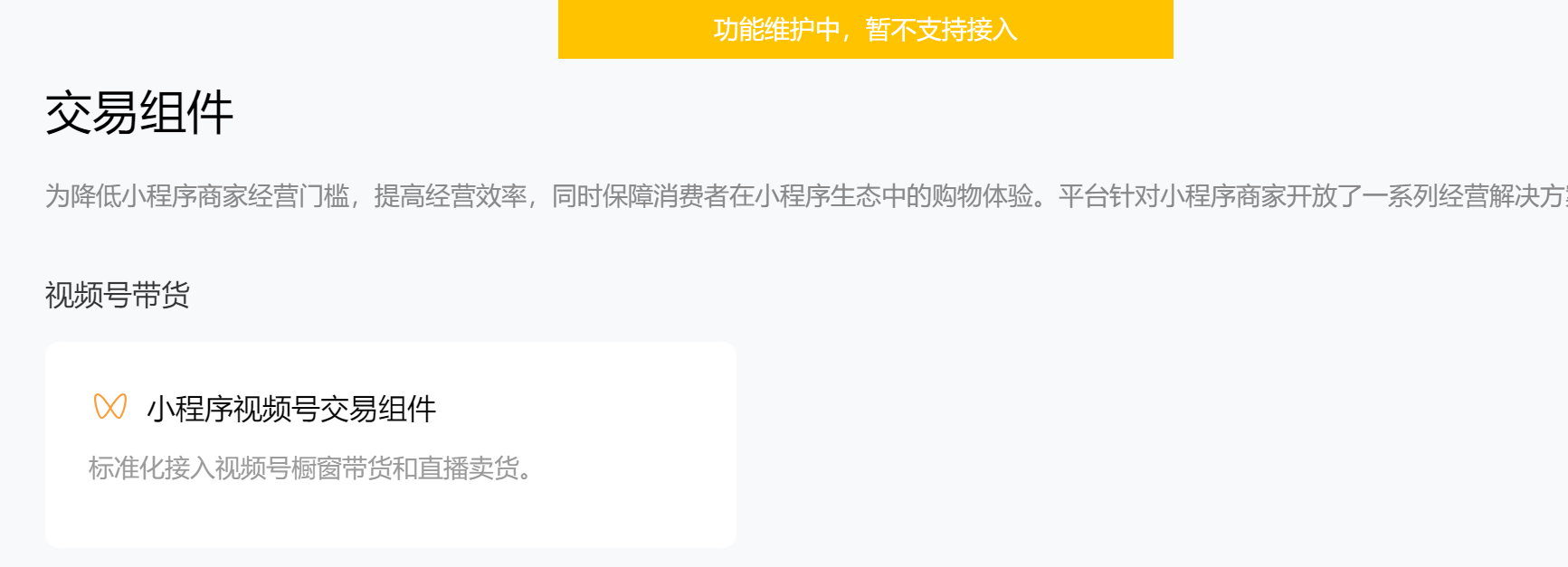 我们现在要接入直播,满足条件了也加看不直播按钮,官方说可以跳视频号直播 但是我们需要把我们的商品放视频号那里直播,需要接入这个 视频号交易组件,现在官方有什么方案 可以让我们做直播吗?可以直播卖自己的产品