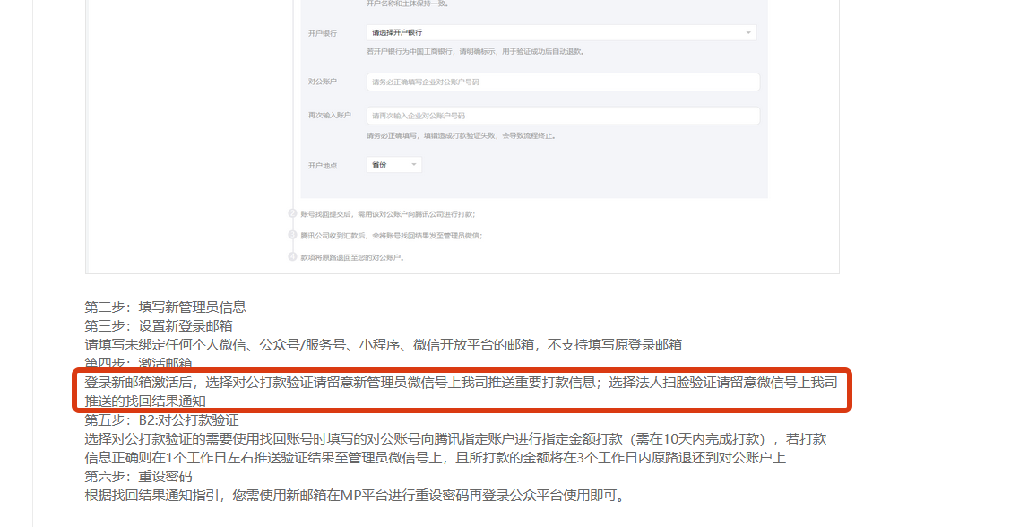 【二是打款验证,提交的时候都很正常,但是无法找到需要打款的信息,造成信息过期未处理,打款信息不在后台通知里,也不在绑定的手机号信息上,难不成发到原管理员那去了吗?】找回账号时填写的那个管理员信息,这个对公打款信息就发到哪个管理员微信。