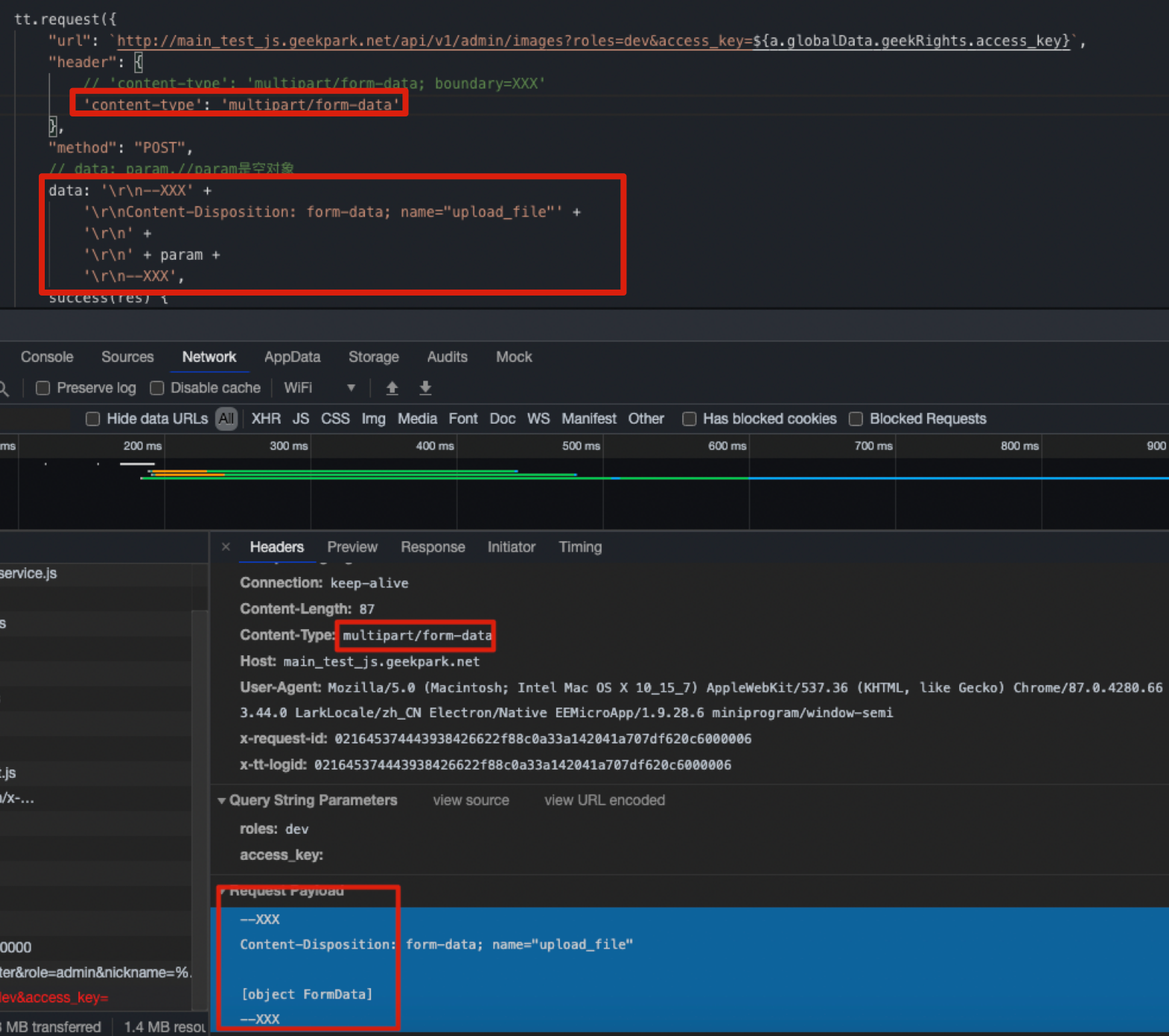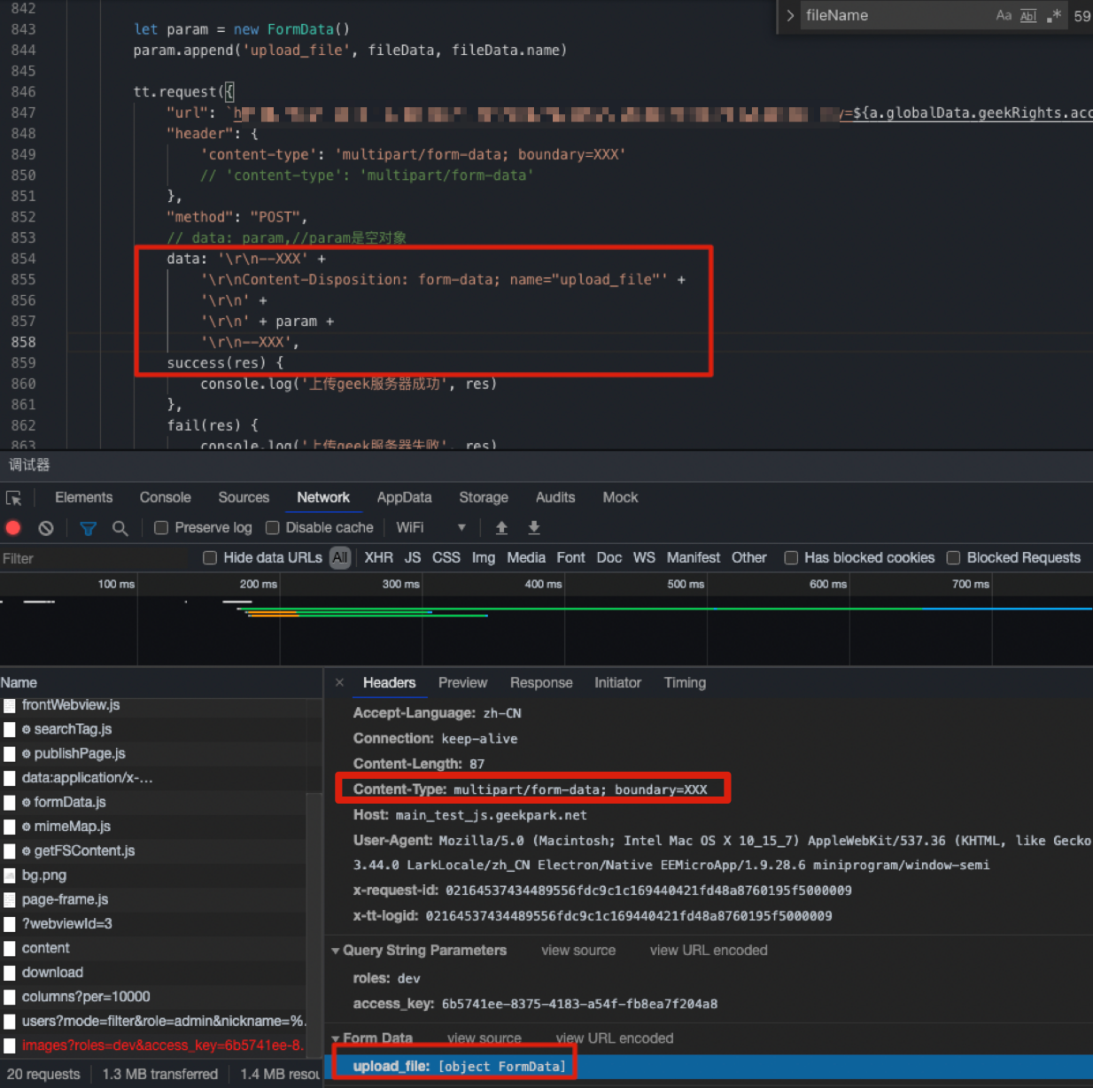 **背景:在飞书小程序开发(和微信小程序类似),需要获取到文本的图片信息,请求飞书接口返回的图片信息是一个二进制流,获取获取blob一个对象。需要把这个图片数据上传到公司的服务器上,变成自己公司的图片。
