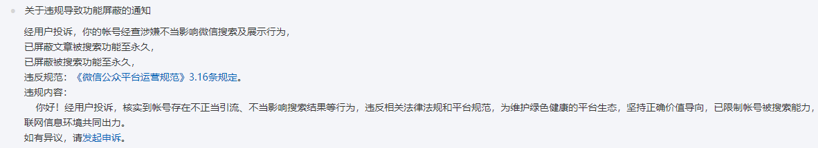 我们这个是刚花三百企业认证过的公众号,是关于鸡蛋农产品价格的公益平台,唯恐怕有什么违规什么的,就就添加了另一个自己的审核过的公众号链接(也是鸡蛋农产品的公众号)先测试一下,结果没有几天,也没有任何警告警示,直接通知公众号“已屏蔽被搜索功能至永久”,现在也按要求整改了,难道就一直这样不能解封了吗?