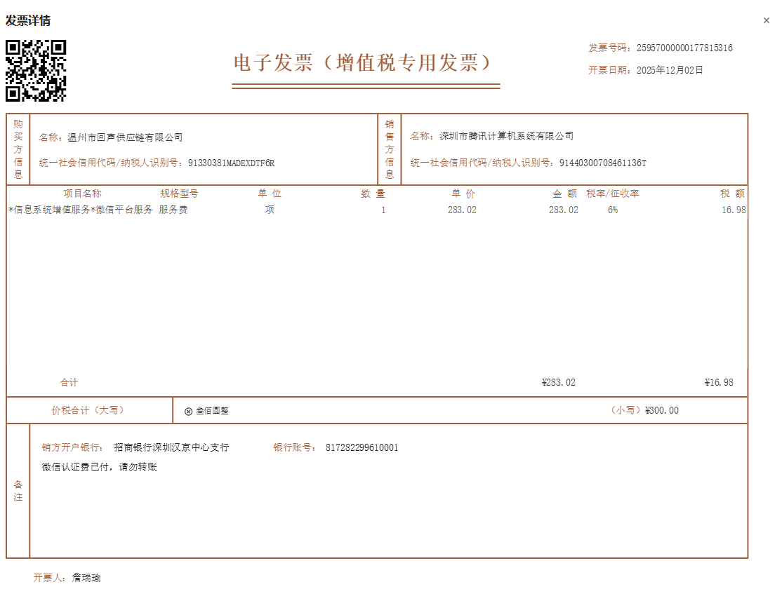 我已联系过第三方审核机构,他们回复只负责提交微信认证中的资料审核业务,发票问题建议您提供后台订单号截图,关注腾讯客服公众号反馈。公众号客服反馈太困难了。