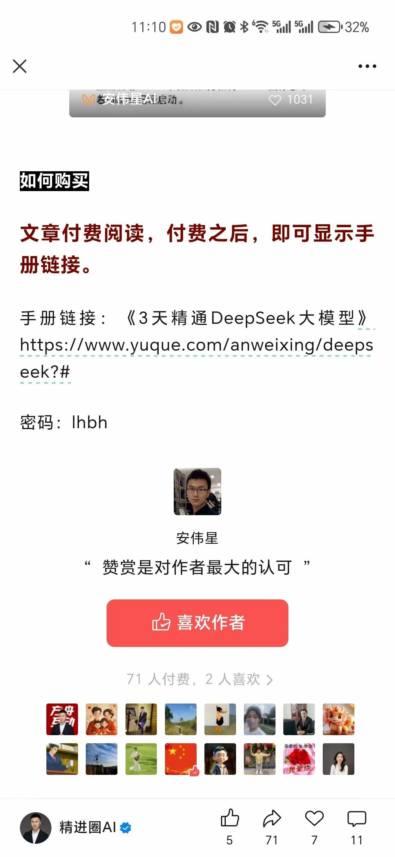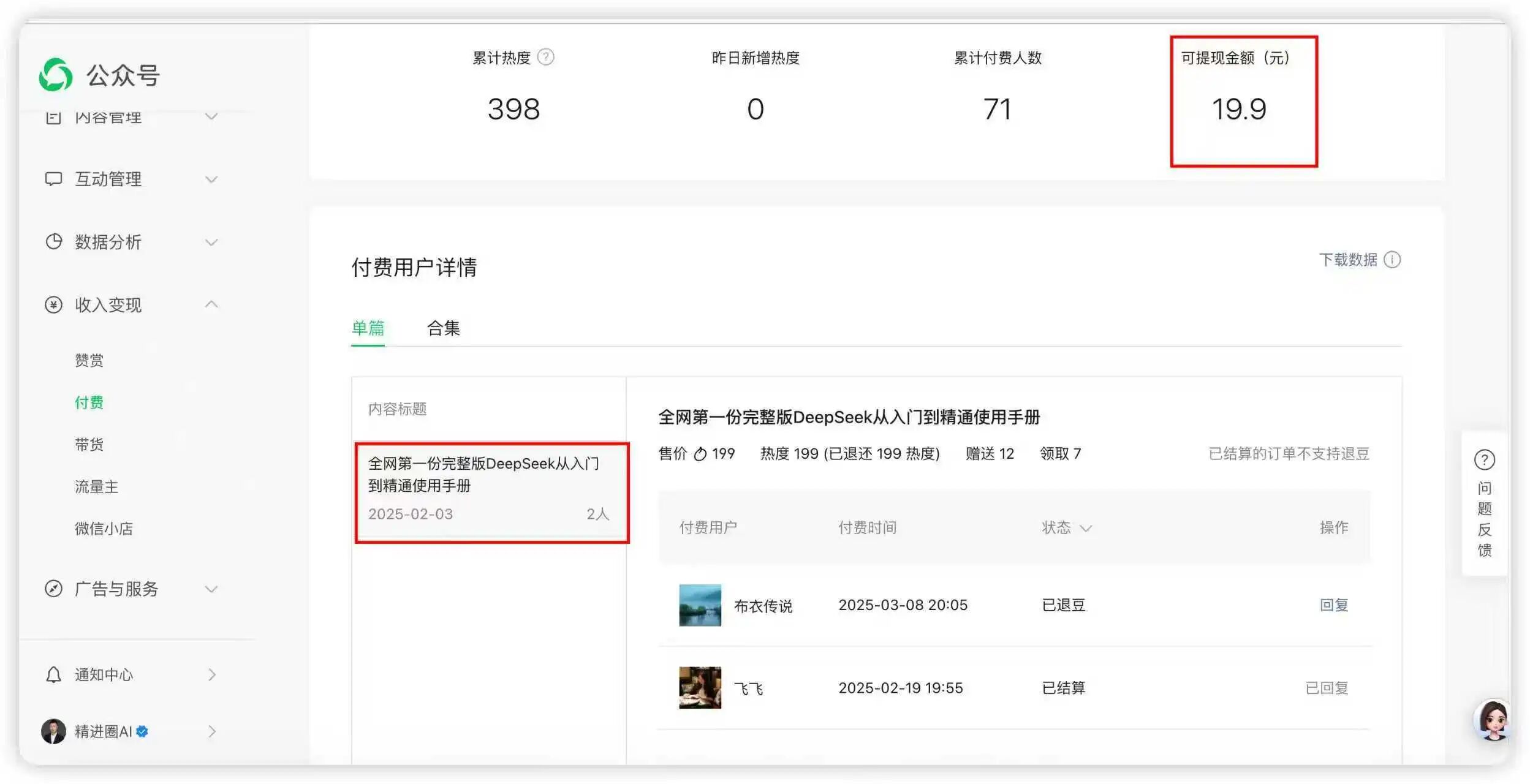 今年2月份,我发表了一篇关于deepseek教程的付费文章,文章收到71人的付费,如下图所示。当时没有提现,我对公众号进行了迁移认证。
