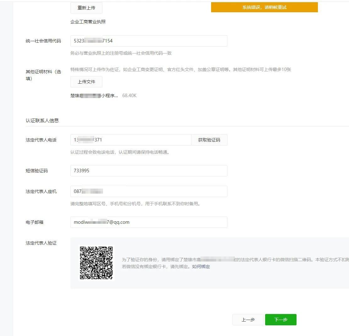 你好,这三天一直在提交小程序改名申请,到第二步填写资料时,填写、上传好所有资料,法定代表人验证以后,点下一步时,一直提示“系统错误,请重新再试”!