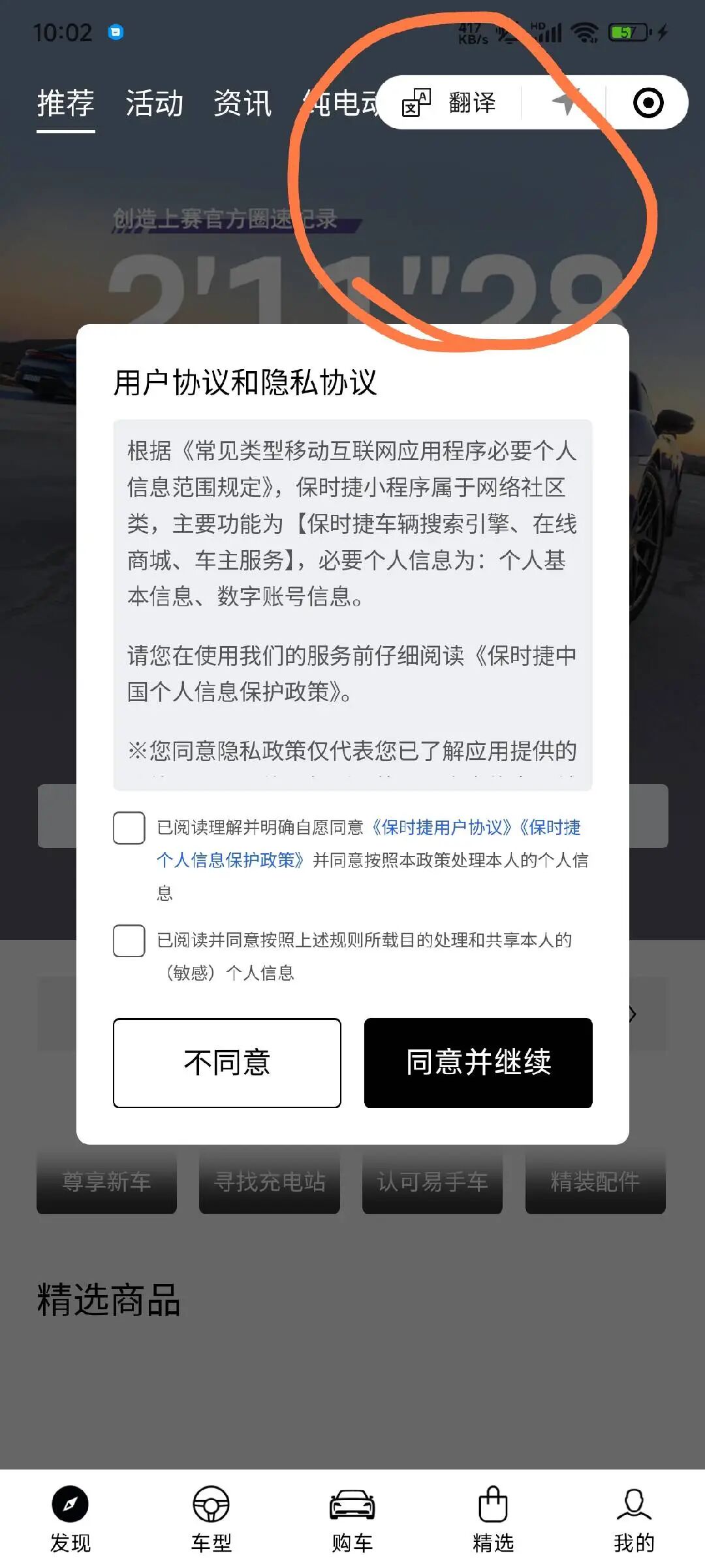 我访问其他小程序,有的小程序会弹出“翻译”,如保时捷,有的小程序又不弹出“翻译”,如小鹏汽车。