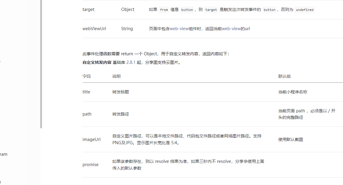 现在有一个需求,要求自己小程序有个按钮,点击按钮能分享自己小程序里某一个页面,或者是某一个url链接,然后转发到微信群里,但看了下文档好像没找到对应的api,想问下微信小程序是否有提供这个功能呢,谢谢
