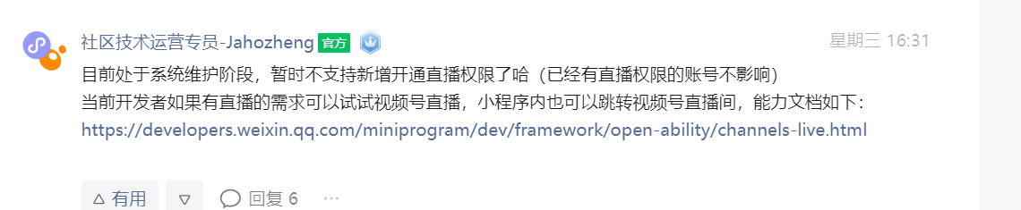 已暂停开通直播权限。我个人觉得后续是否还开通不乐观。参考链接:https://developers.weixin.qq.com/community/develop/doc/000426bf01cd203584df77b7756000