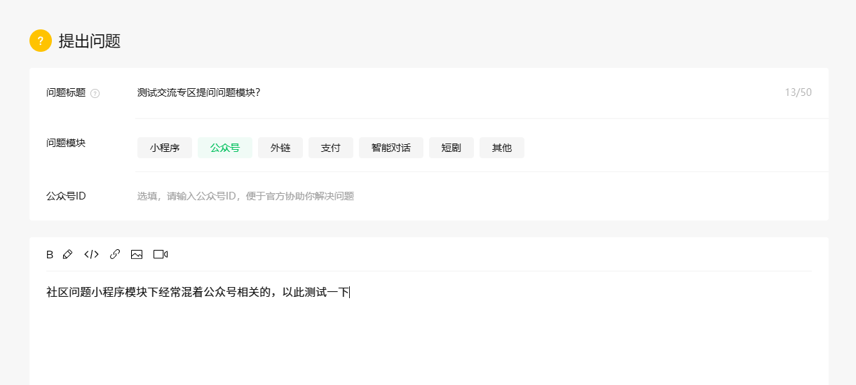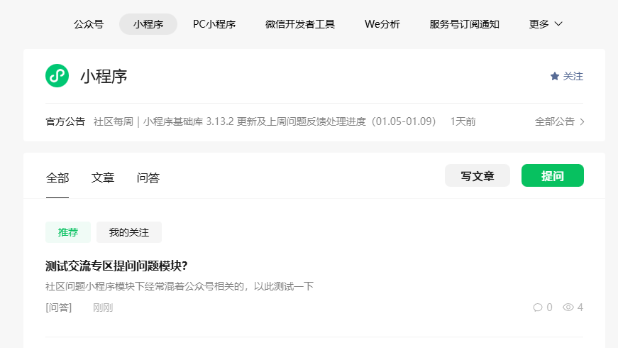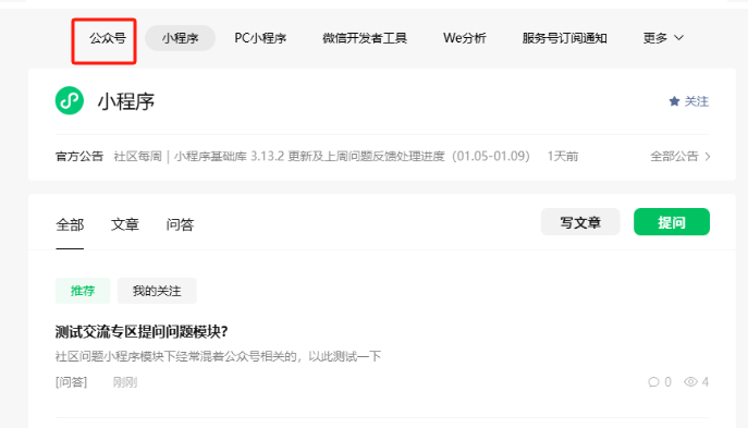 社区问题小程序模块下经常混着公众号相关的,以此测试一下