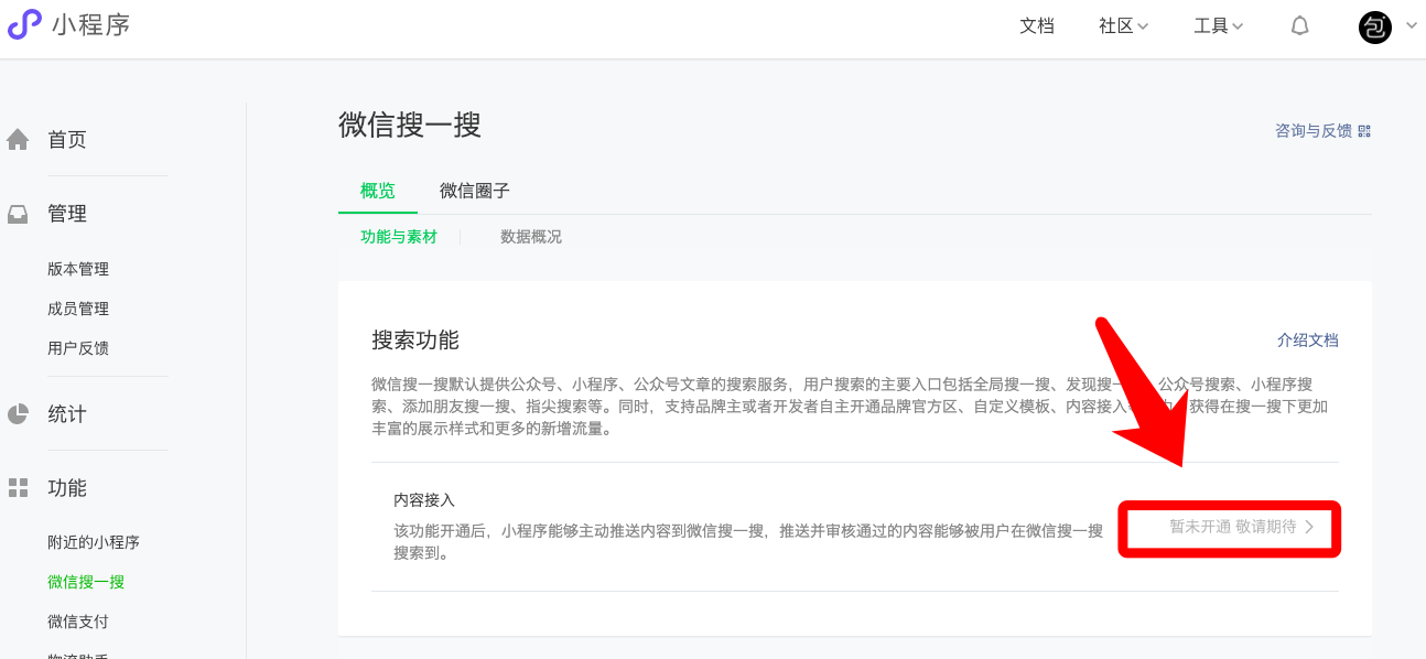 补充:在对应的公众号后台找到微信搜一搜,也没有看到内容接入的开通入口