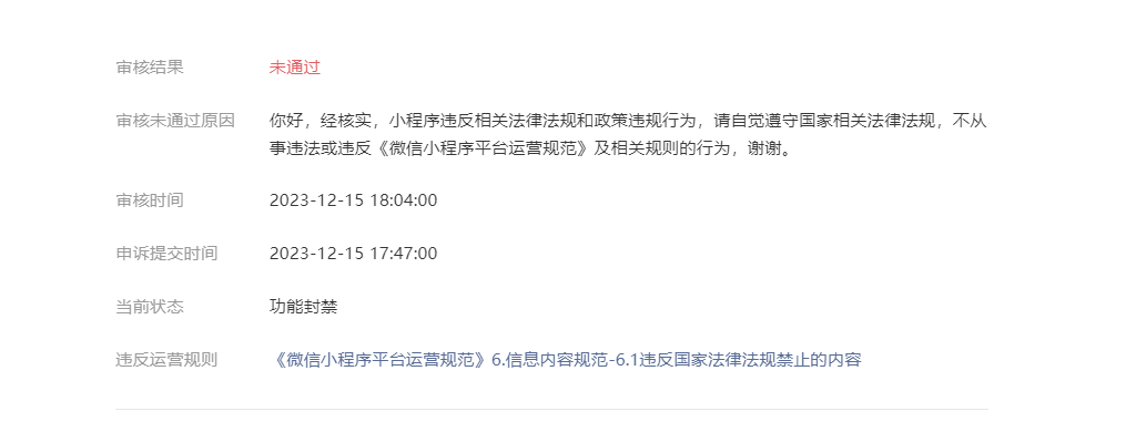 感谢反馈,申诉结果已通过站内信下发,可在mp后台登录查看详情