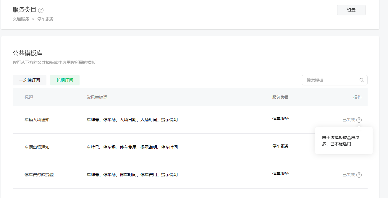 服务号如果使用订阅通知进行消息推送,已经不支持长期订阅了吗?我们这边有个公众号是关于停车服务的,目前长期订阅都无法使用了,去年看的时候还是可以正常使用的?难道去年就开始用不了了吗?如果无法使用长期订阅功能,那一次性订阅功能与长期订阅功能有什么区别呢?烦请各位大佬做下解答,谢谢!