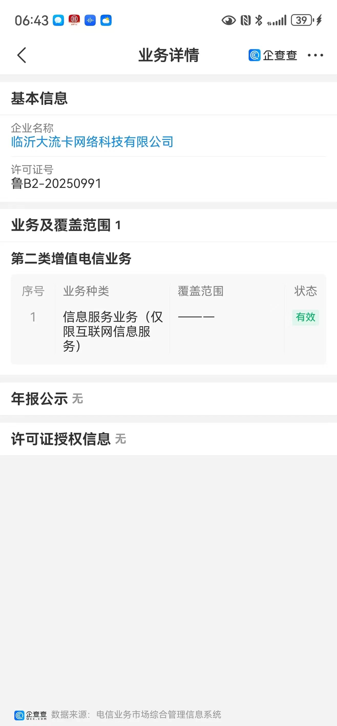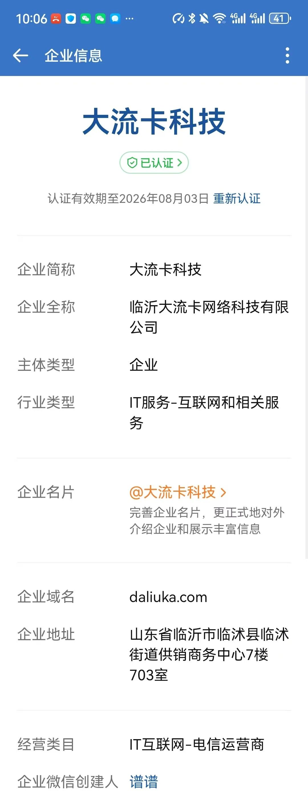 我们公司是临沂大流卡网络科技有限公司,目前通过企业微信经营私域,主要业务是流量卡,全程都是合法合规,企业域名正规备案,有运营商授权,以及电信经营许可证,目前企业微信已经经营一年,外部联系人已经上万。
