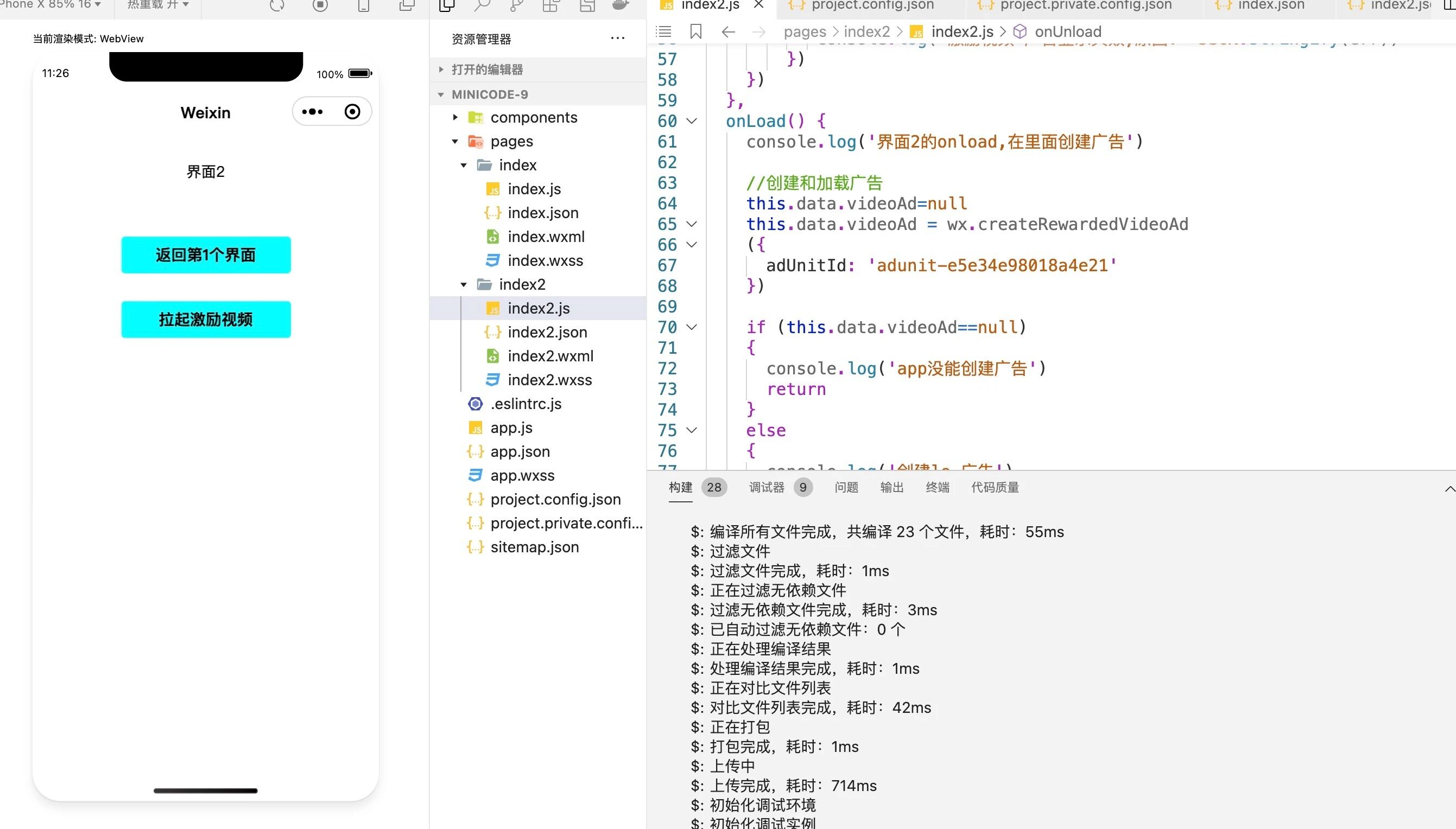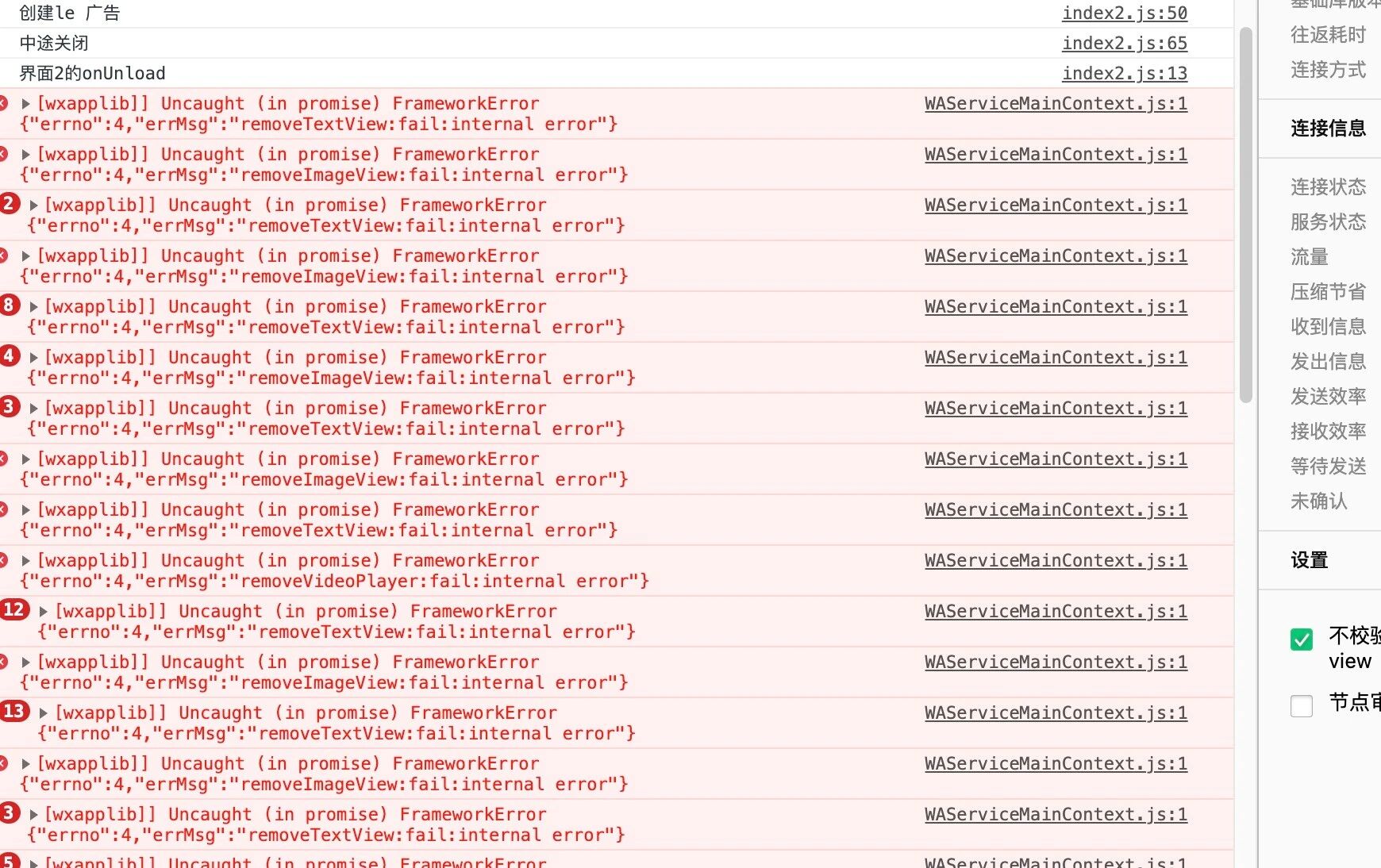 方式一:不在 unload 时销毁广告,也不要在 onload 时重复创建广告。一旦创建过就一直使用同一个实例。比如:if (!ad) { ad = wx.createRewardedVideoAd },在第一次时才创建