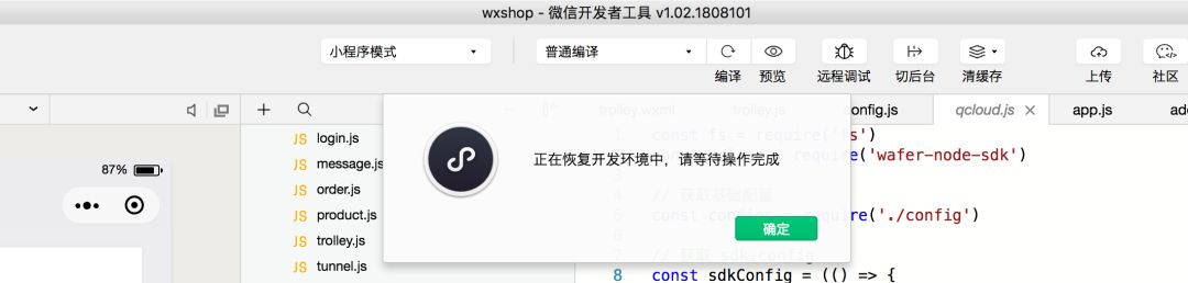 微信开发这工具中点击腾讯云恢复开发环境,从昨晚开始就一直提示 正在恢复开发环境中,请等待操作完成