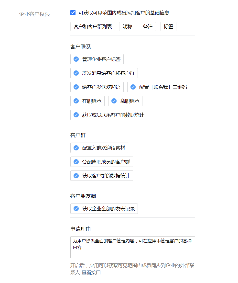 - 看文档说需要第三方应用需具有“企业客户权限->客户基础信息”权限