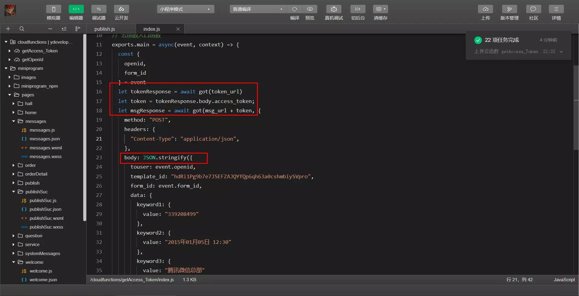 这是云函数的部分,我认为有问题的地方应该在这儿。但是我不知道具体。应该是access_token和body的格式问题。但是就是不知道怎么修改,求解