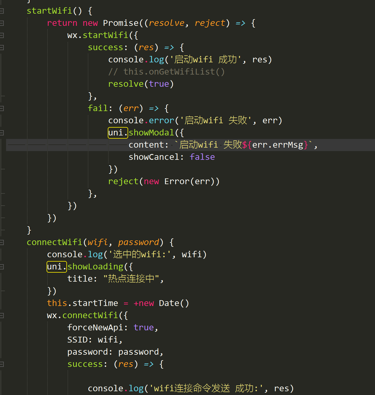 connectWifi调用之前有调用startWifi方法的,connectWifi还加了forceNewApi参数,微信的定位权限也有打开