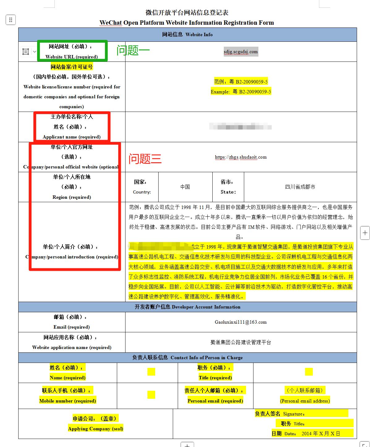 3、【微信开放平台网站信息登记表】表格中的【主办单位名称/个人】、【单位/个人简介】、【单位简介】等是填A公司的还是B公司的呢?