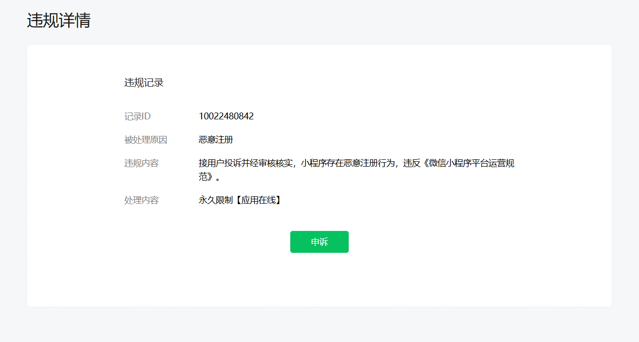 我也是同样的问题,小程序前天上午上线,下午就提示被封了,和楼主一样的原因。重点是,站内信功能也被封了,打开一篇空白,根本看不到站内消息。 然而小程序是在正常运转的,就是这个账号被封了,不知道能不能换账号