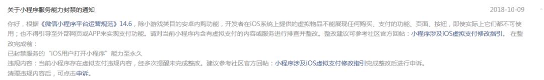 我们后天目前收到消息是这条,申诉被拒才发帖的。这种情况,您说的警告到期能给个期限吗?警告多久,一个月?,我们的ios用户打开小程序服务大概什么时候可用?