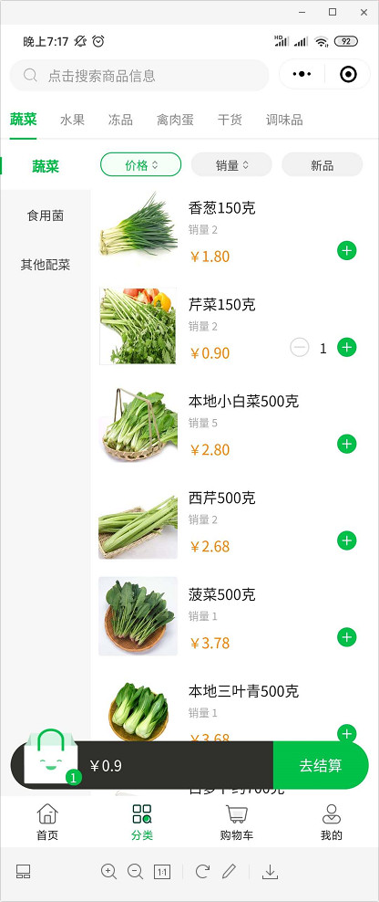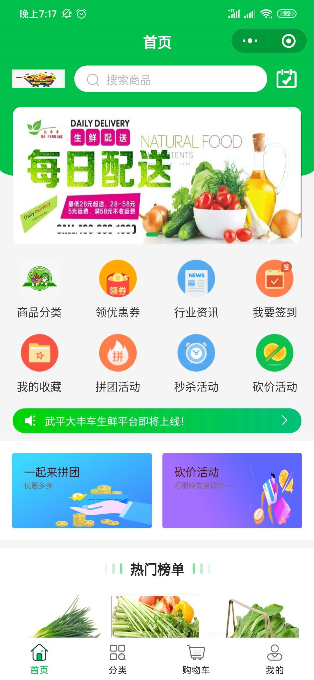 格创网络生鲜水果蔬菜小程序专门针对中小商户开发,模板为绿色生鲜类模板,小程序集成了秒杀、团购、优惠券、会员管理等功能。