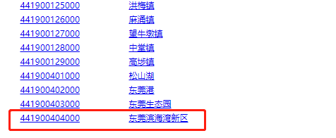 比如:东莞市东城街道就是441901;东莞市南城街道就是441902