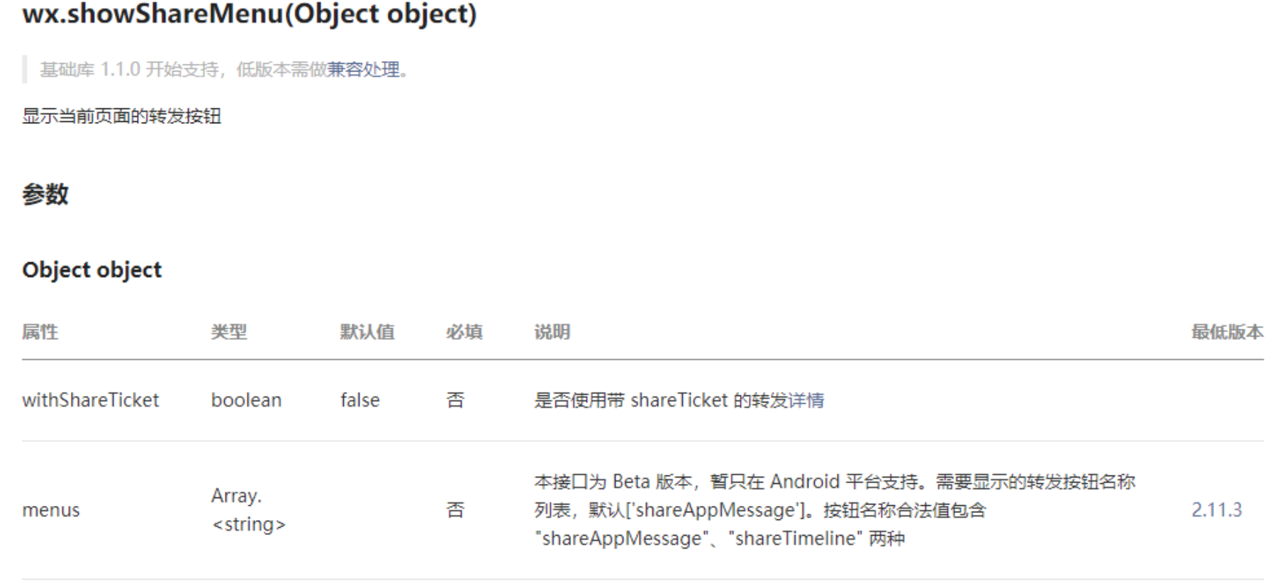 showShareMenu({ withShareTicket: true, menus: ['shareAppMessage','shareTimeline'] } 这个一定要加上才能生效 否则就是置灰的