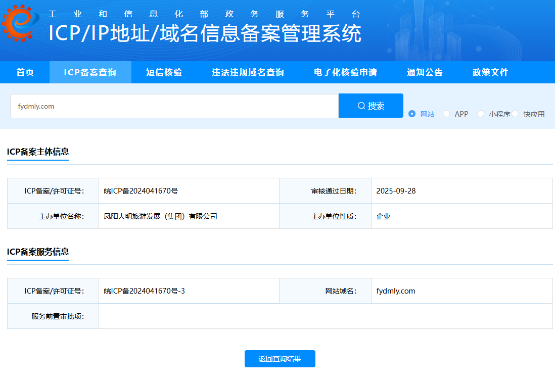 您好,域名 fydmly.com浏览器访问正常,该网址是凤阳大明旅游的官网。微信访问,点开网址提示“非微信官方网页,请确认是否继续访问”经检查网页里没有不安全的内容且网站已备案(ICP备案/许可证号:皖ICP备2024041670号),请核实后帮忙解除拦截,谢谢!尽快处理,谢谢