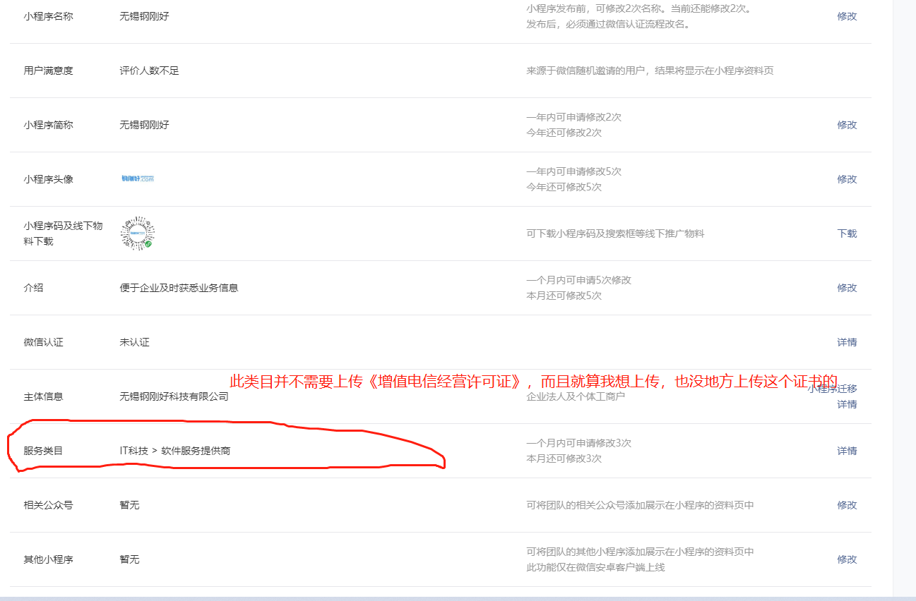 我的小程序头像以及基本信息提交审核失败,原因要我上传《增值电信业务经营许可证》,但是我选中的类目并不需要这个证书,而且我的小程序是绑定的公众号,请问为何还要我提供这个证书,而且就我选的类目我也没地方上传《增值电信业务经营许可证》,请问这个如何处理?