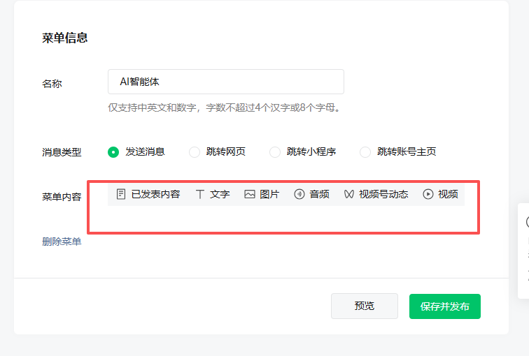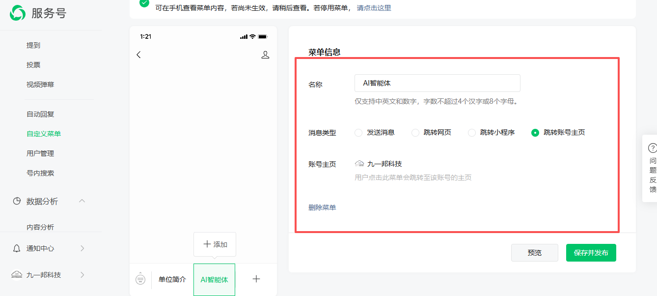 扣子开发的智能体已经授权给了公众号,目前我需要在公众号后台把智能体添加至自定义菜单中,用户端就可以通过公众号进入使用智能体,但公众号在添加定义菜单时,不知道如何关联扣子开发的智能体,请帮忙告知