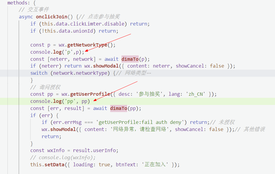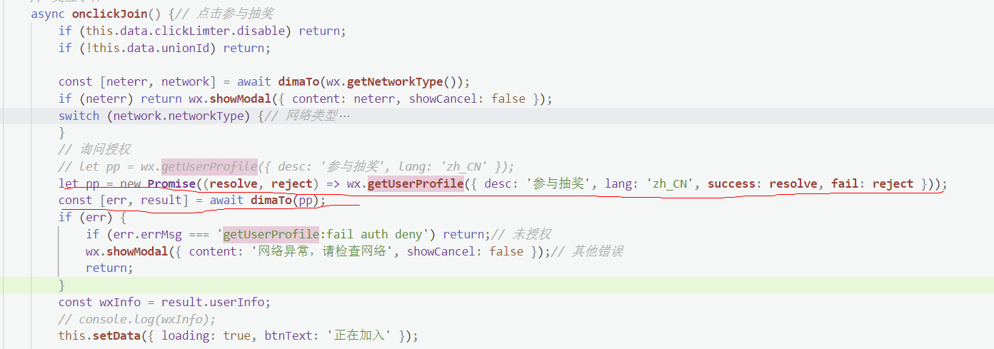 // to.jsfunction to(promise) {return promise.then(data => {return [null, data];}).catch(err => [err]);}await wx.getUserProfile()