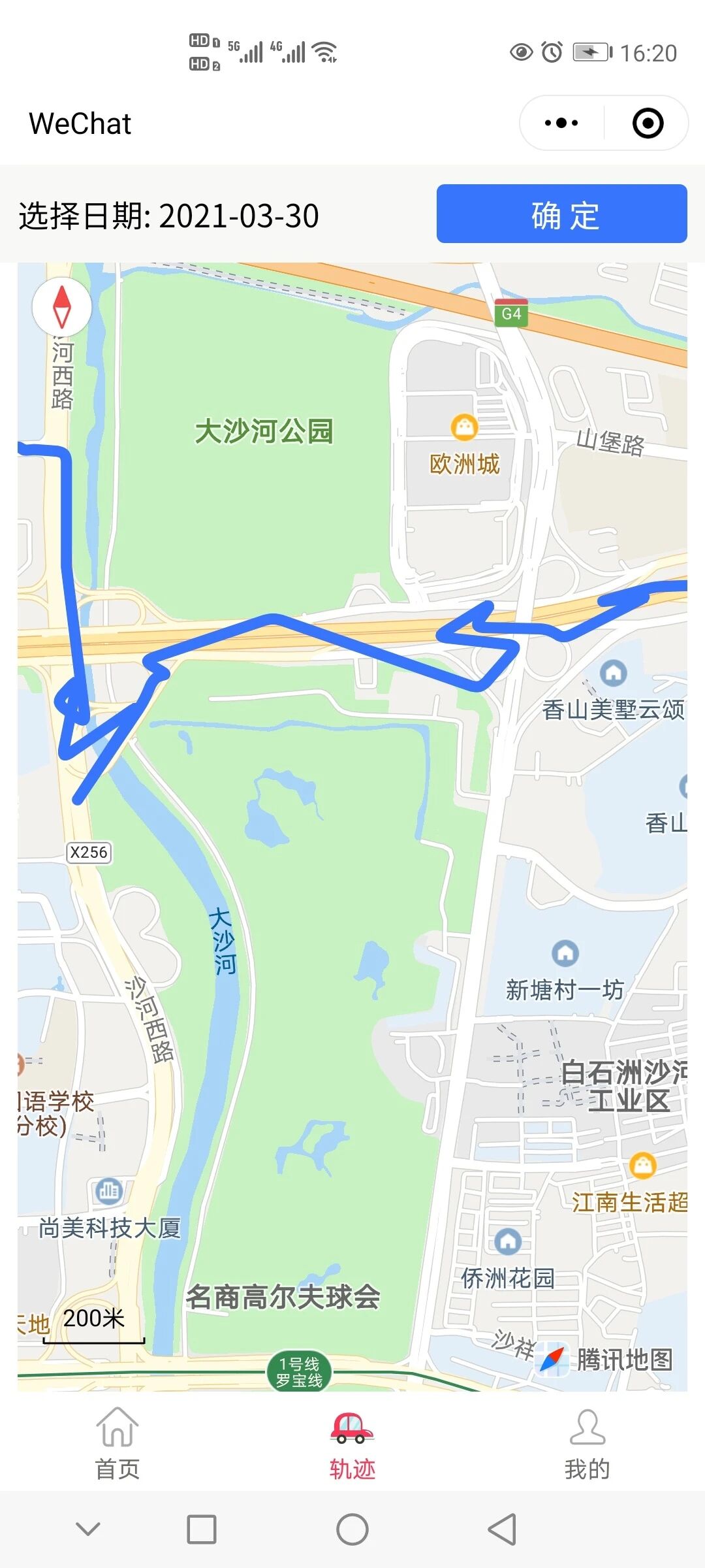 wx.getLocation({ type: 'gcj02', //type: wgs84/gcj02 success (res) { util.request(api.ApiInsert, { latitude: res.latitude, longitude: res.longitude, speed: res.speed, accuracy: res.accuracy },"POST").then(function (data) { if (data.statusCode != 200) { console.log("轨迹记录失败: " + data.message); } }); } }) 点击“停止记录轨迹”按钮时,终止以上动作。 在轨迹页面中选择一个要回放的日期后进行初始化数据,主要代码如下: util.request(api.ApiGetLocation, { date: this.data.date }, 'GET').then(res => { if (res.statusCode == 200) { this.setData({ location: { latitude: res.data[0].latitude, longitude: res.data[0].longitude }, markers: [{ id: 1, latitude: res.data[0].latitude, longitude: res.data[0].longitude, width: 16, height: 20, iconPath: 'https://mapapi.qq.com/web/lbs/javascriptGL/demo/img/car.png', }], polyline: [{ points: res.data, color: '#3875FF', width: 6 }] }); } })初始化完数据后,当用然点确定时进行模拟回放,主要代码如下: