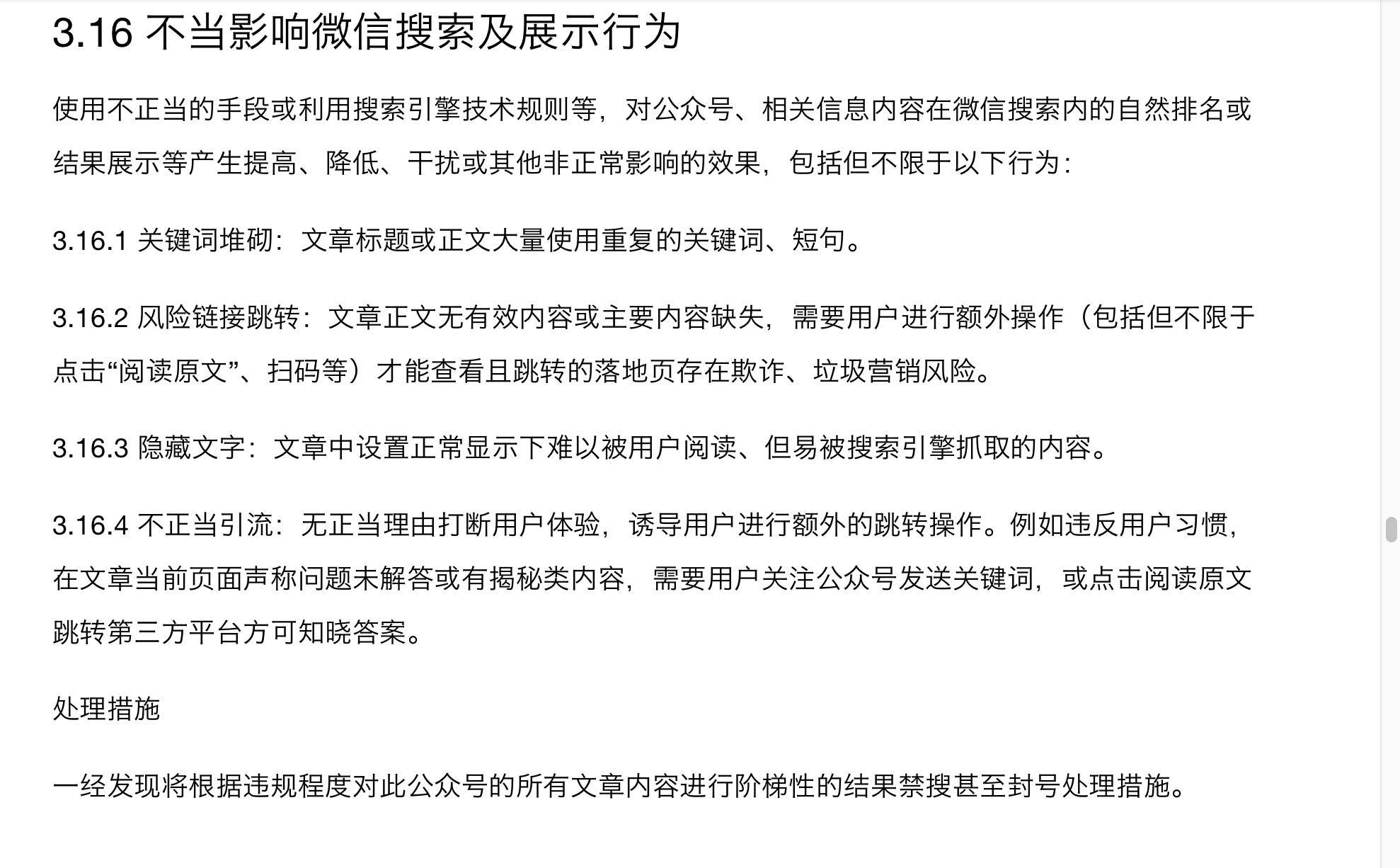违反规则的处置措施“对公众号文章采取阶梯式禁搜甚至封号处置” :我公众号是直接全部禁搜,详情看微信社区贴https://developers.weixin.qq.com/community/develop/article/doc/00042275b58d8040c05fee96756413