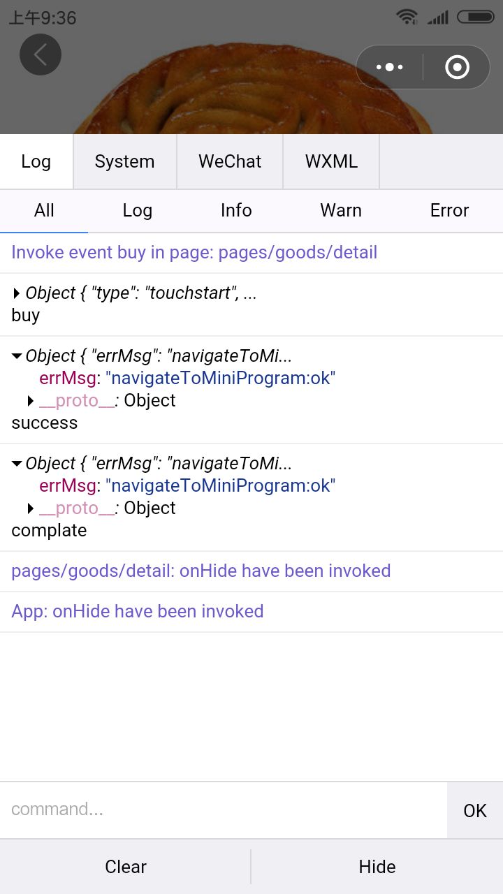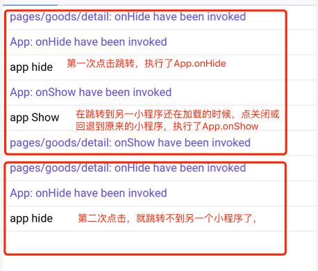 2.测试机(红米),我是第一次点可以正常跳转到另一小程序,在跳转的另一小程序页面还在加载的时候,点返回或关掉了,第二次点击就没有反应,跳转不过去了(第二次点的调试信息如图2)