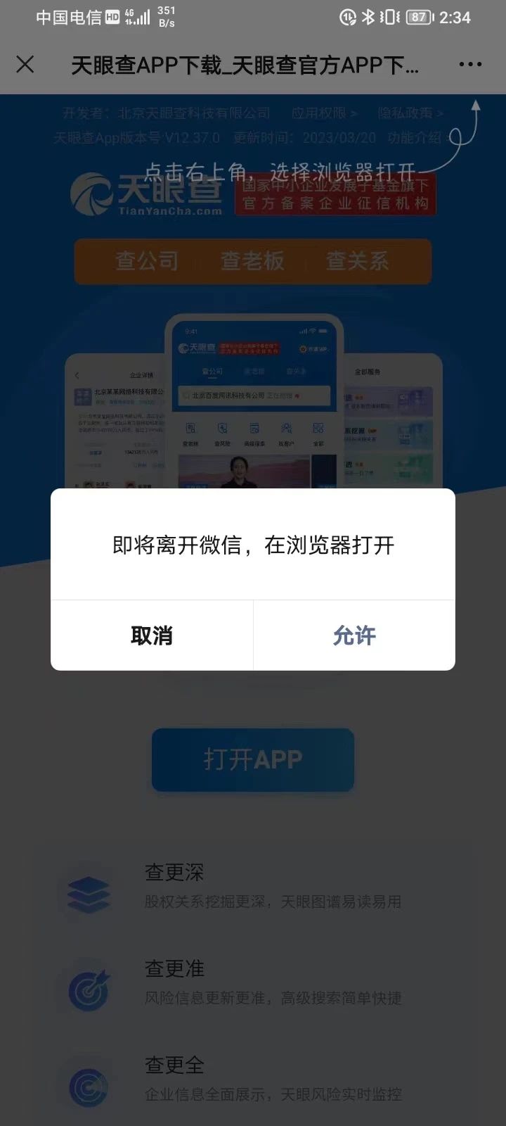 微信内一打开网页就可以自动弹出“即将离开微信,在浏览器打开”,引导选择浏览器打开指定网页。