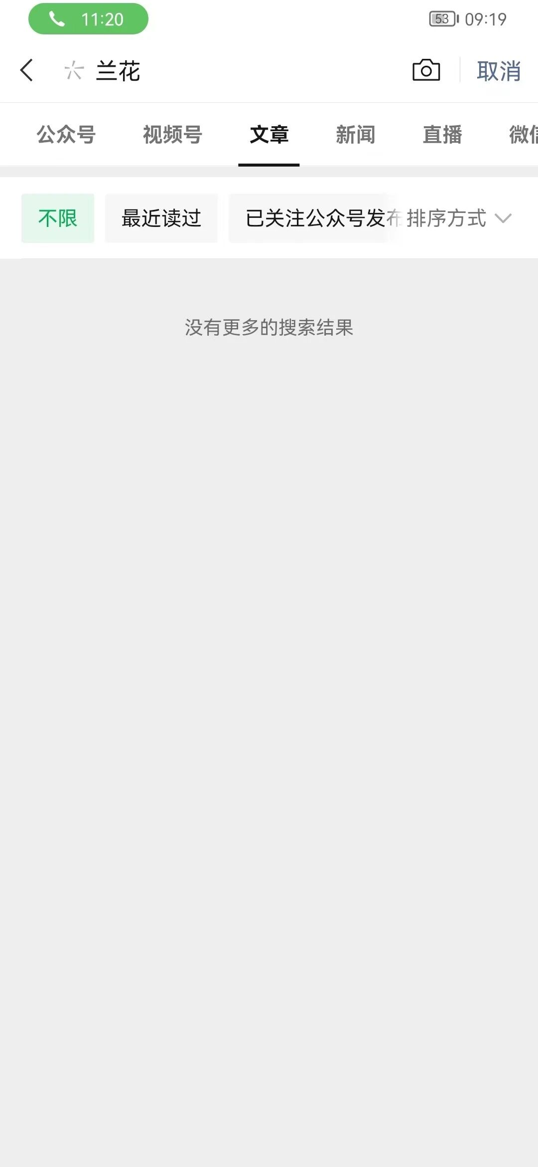 最近一周时间吧,刚刚发现在微信搜一搜功能里, 输入搜索点击“文章”,什么都不显示了,自己是个人用户,平常连个广告都不发,都是生活类还是偶尔发发,不觉得是被屏蔽或者之类的,但是又没有做过其他的,想知道怎么解决。 平常在搜一搜里用“文章”看一些信息,也不是违规的操作吧?看的内容也不是涉及敏感的话题或者字眼。都是日常生活之类的。