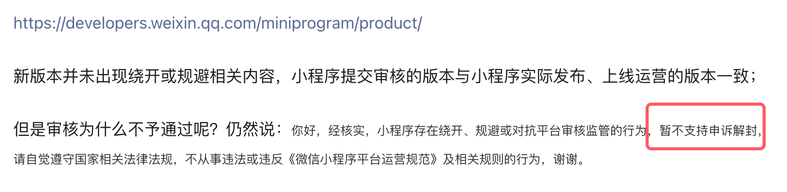 但是审核为什么不予通过呢?仍然说:你好,经核实,小程序存在绕开、规避或对抗平台审核监管的行为,暂不支持申诉解封,请自觉遵守国家相关法律法规,不从事违法或违反《微信小程序平台运营规范》及相关规则的行为,谢谢。