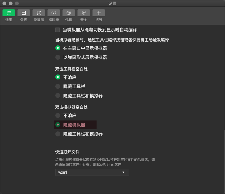 首要要说,0807版本「新增 模拟器支持隐藏展开设置、调试器增加位置配置、支持跟随模拟器同窗口弹出」功能很实用,简单设置下就可以让开发者工具做一个安静的模拟器和调试器。