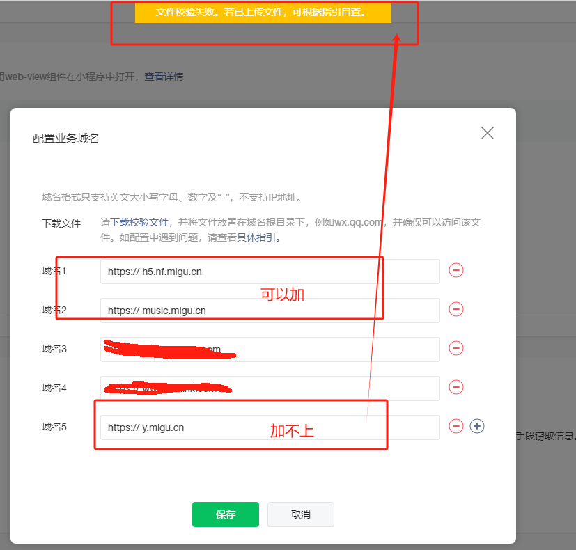 小程序添加业务域名,在网页能打开校验文件:https://y.migu.cn/WbVCQhMBi3.txt,也是放在根目录的,为什么还是一直提示“文件校验失败”,导致y.migu.cn无法添加到业务域名。